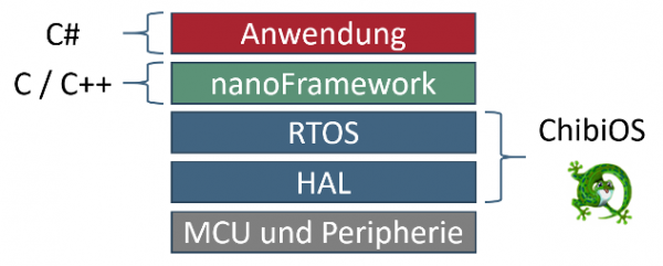 Das nanoFramework ist in verschiedenen Layern aufgebaut. Die Verwendung eines Echtzeitbetriebsystems ist dabei nicht zwingend nötig. Das nanoFramework kann auch direkt auf dem Mikrocontroller betrieben werden. Wir haben auf Grund der für STM32 Mikrocontroller optimierten und umfangreichen HAL vom ChibiOS die Variante via Echtzeitbetriebssystem gewählt. Das nanoFramework besteht wiederum aus zwei Teilen. Einerseits aus dem nanoBooter, welcher für den korrekten Start des Frameworks zuständig ist und andererseits aus der bereits erwähnten .NET Common Language Runtime, genannt nanoCLR. Diese Aufteilung ermöglicht ein weiteres Feature des nanoFrameworks: Das nanoCLR sowie die C# Benutzeranwendung können während dem Betrieb aktualisiert werden. Somit können Erweiterungen der .NET Klassen oder neue Features in der C# Benutzeranwendung fortlaufend ergänzt werden. Die Layer HAL, RTOS und nanoFramework sind nur während der Portierung auf die gewünschte Hardwareplattform oder Erweiterungen der .NET Klassen zu bearbeiten. In der eigentlichen Anwendungsentwicklung kann sich der Entwickler dann ausschliesslich auf seine C# Anwendung konzentrieren, welche auf dem obersten Layer zu liegen kommt.