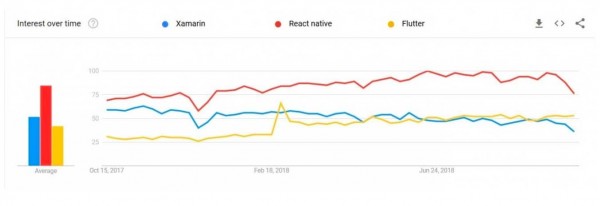Google trends worldwide for Xamarin, React native and Flutter (retrieved on 11th October 2018)