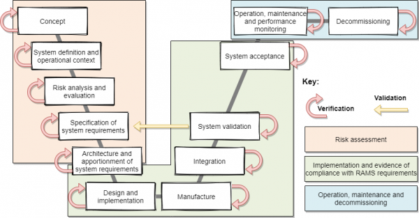 Process standard EN 50126-1:2017 sets out an all-purpose approach to verification that divides the system development life cycle into twelve distinct phases. Verification takes place at the end of each respective phase, as represented by the red arrows in the diagram below.
